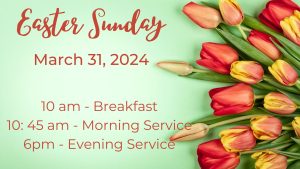 Easter Sunday April 5th, 2026 10:00 amJoin us for our Easter Services: 10:00 am – Breakfast 10:45 am – Morning Service 6:00 pm – Evening Service We look forward to having you visit with us! Save the Date SHARE ON Twitter Facebook Buffer LinkedIn Pin It